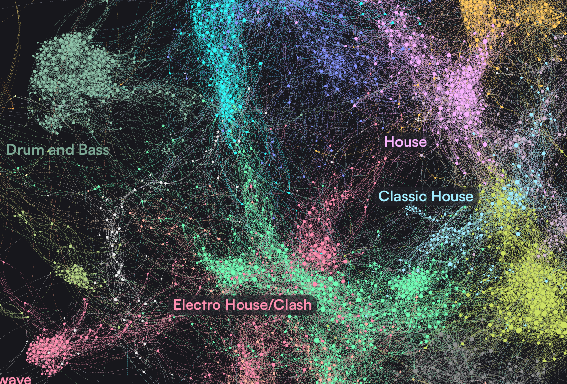Over 5000 electronic artists mapped by their Spotify listeners.