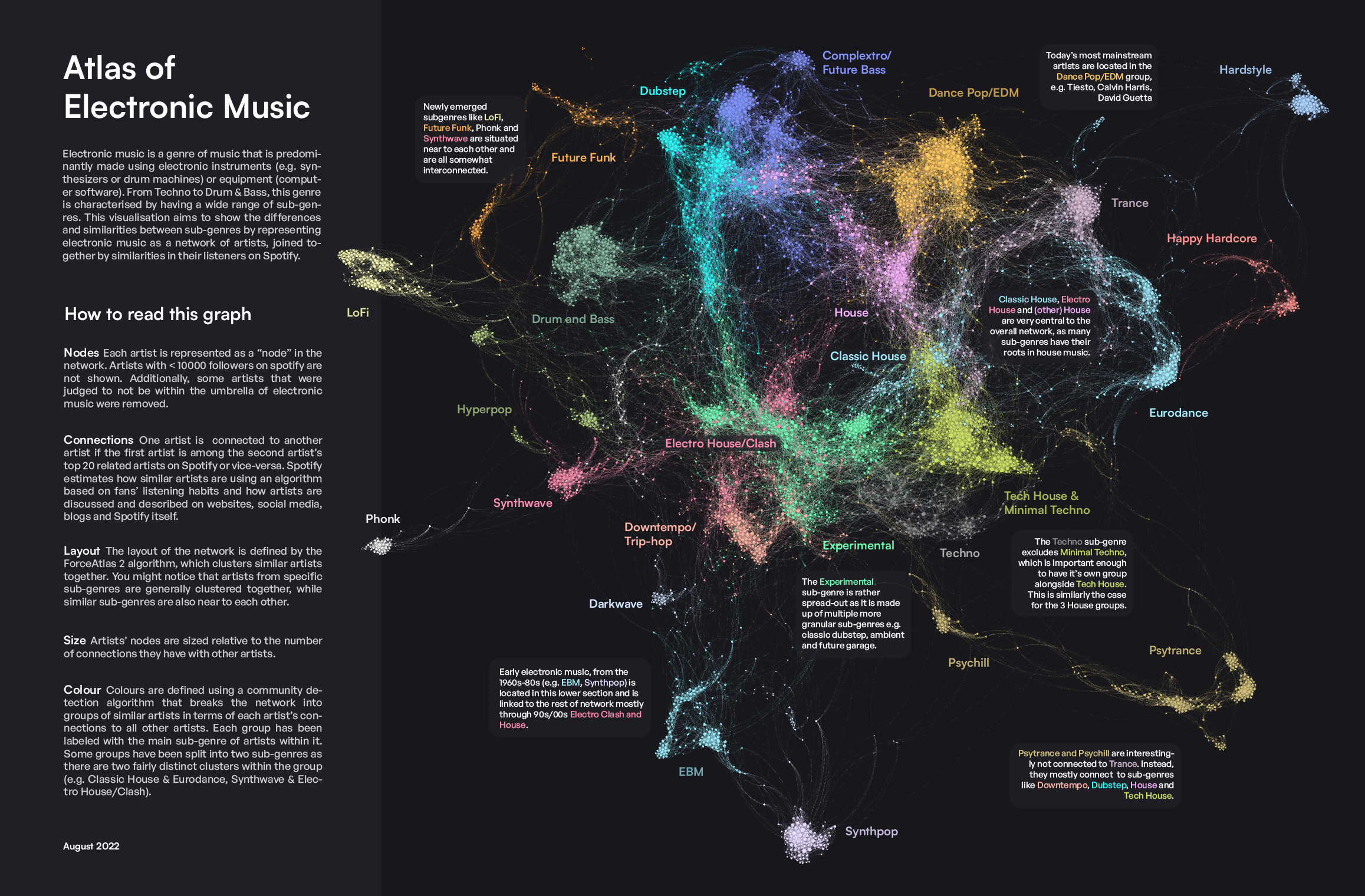 This visualisation took quite a while to make, with a lot of back and forth required before I was happy with it, and while it’s not a perfect representation of the universe of electronic music, I think it still turned out pretty well.