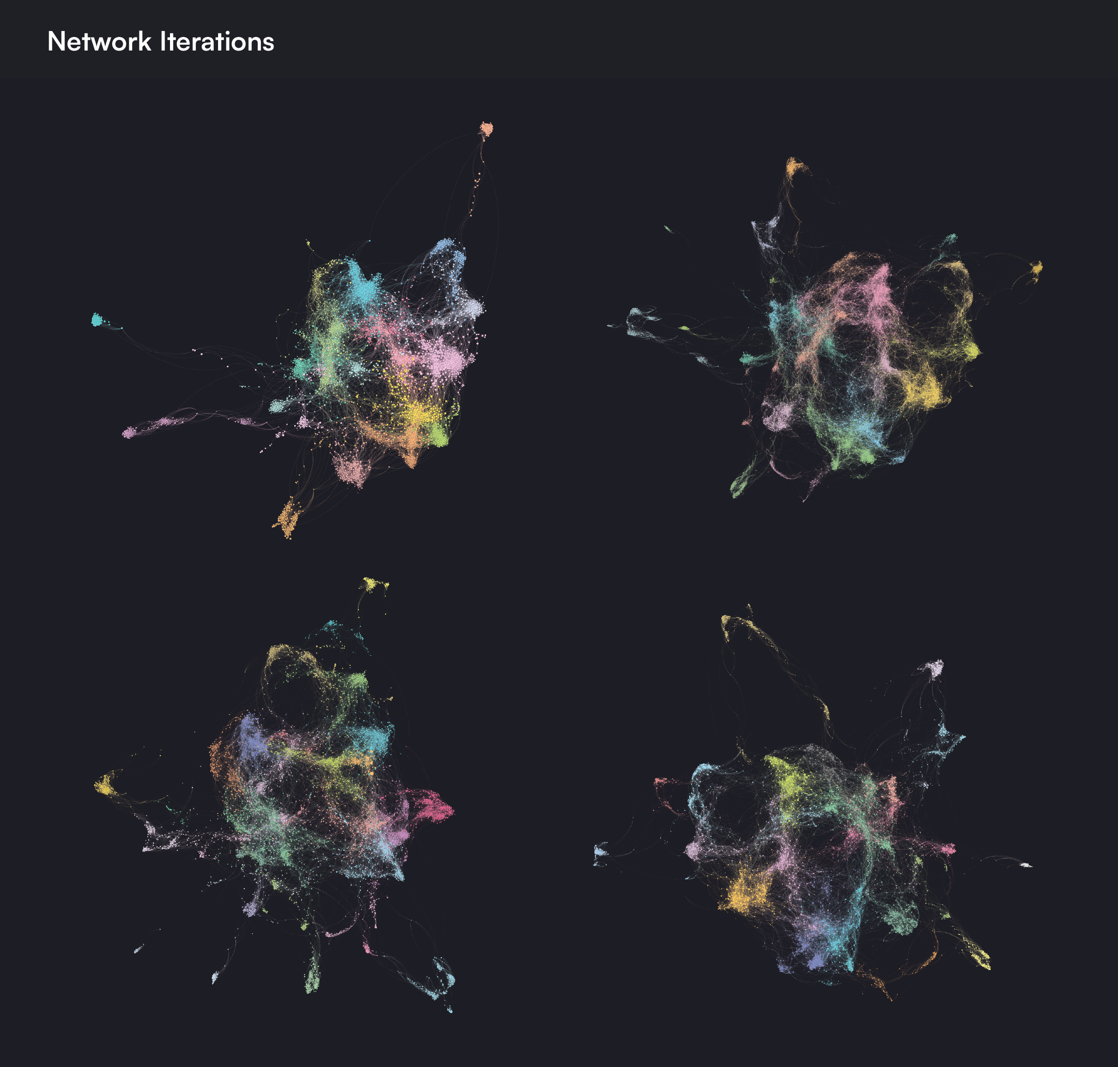 The data was visualised using Gephi. I used a type of graph called a force-directed-graph, employing the ForceAtlas 2 algorithm. To add a splash of colour to the visualisation I used a community detection algorithm. This works by dividing the network into “modularity classes” - groups that generally have denser connections to nodes within the same modularity class than to nodes within other classes. Each colour in the network represents a different modularity class.