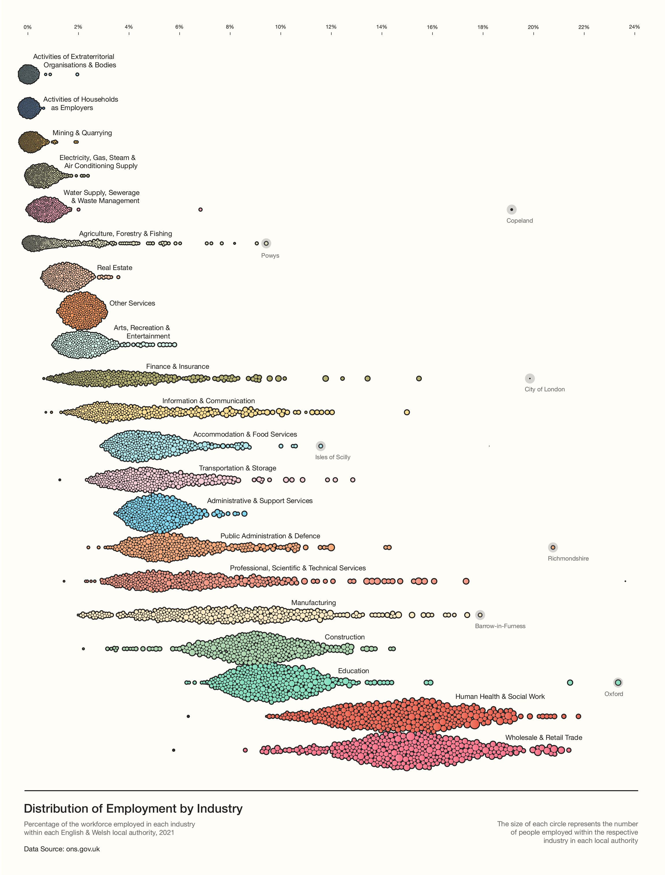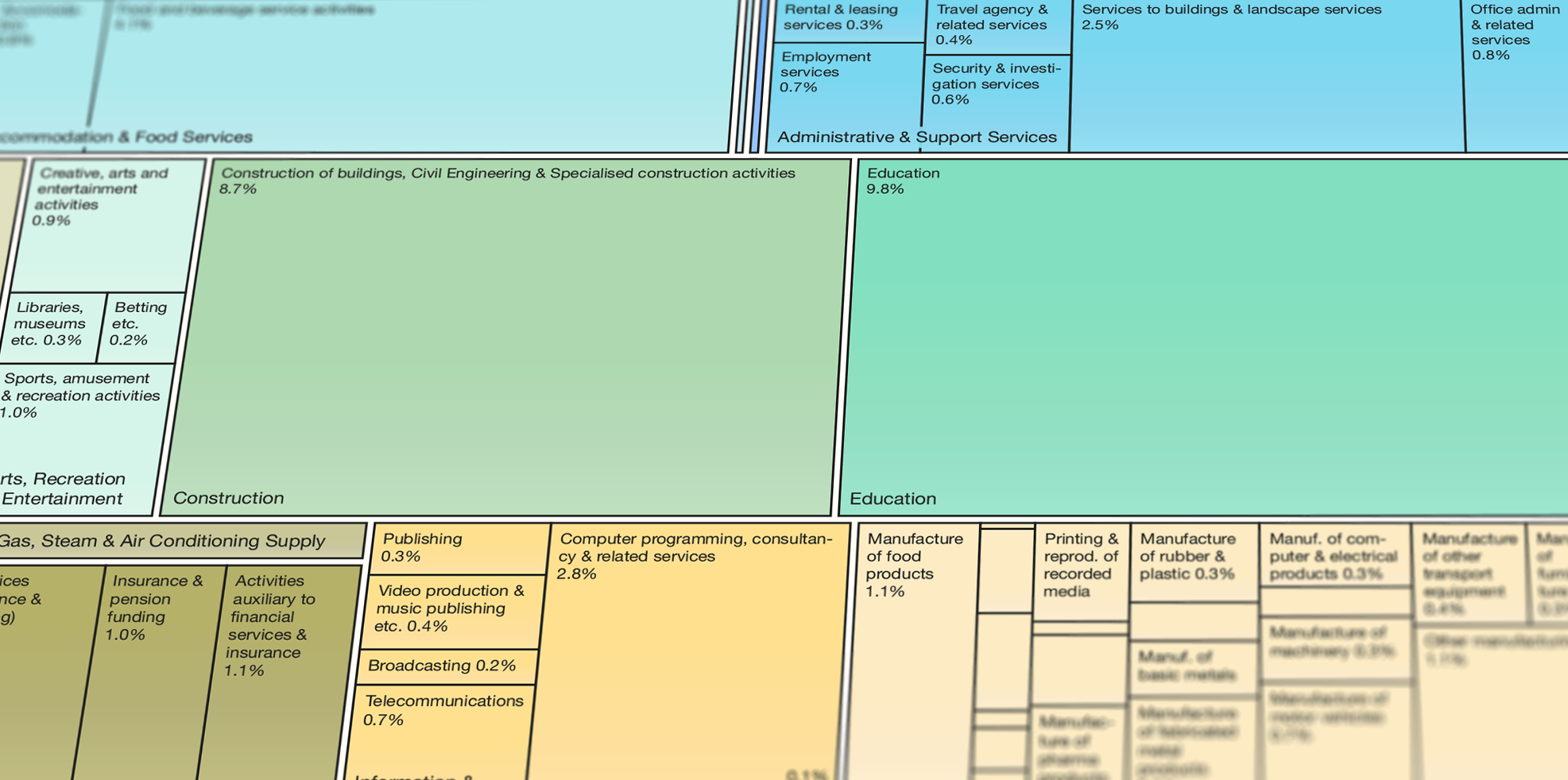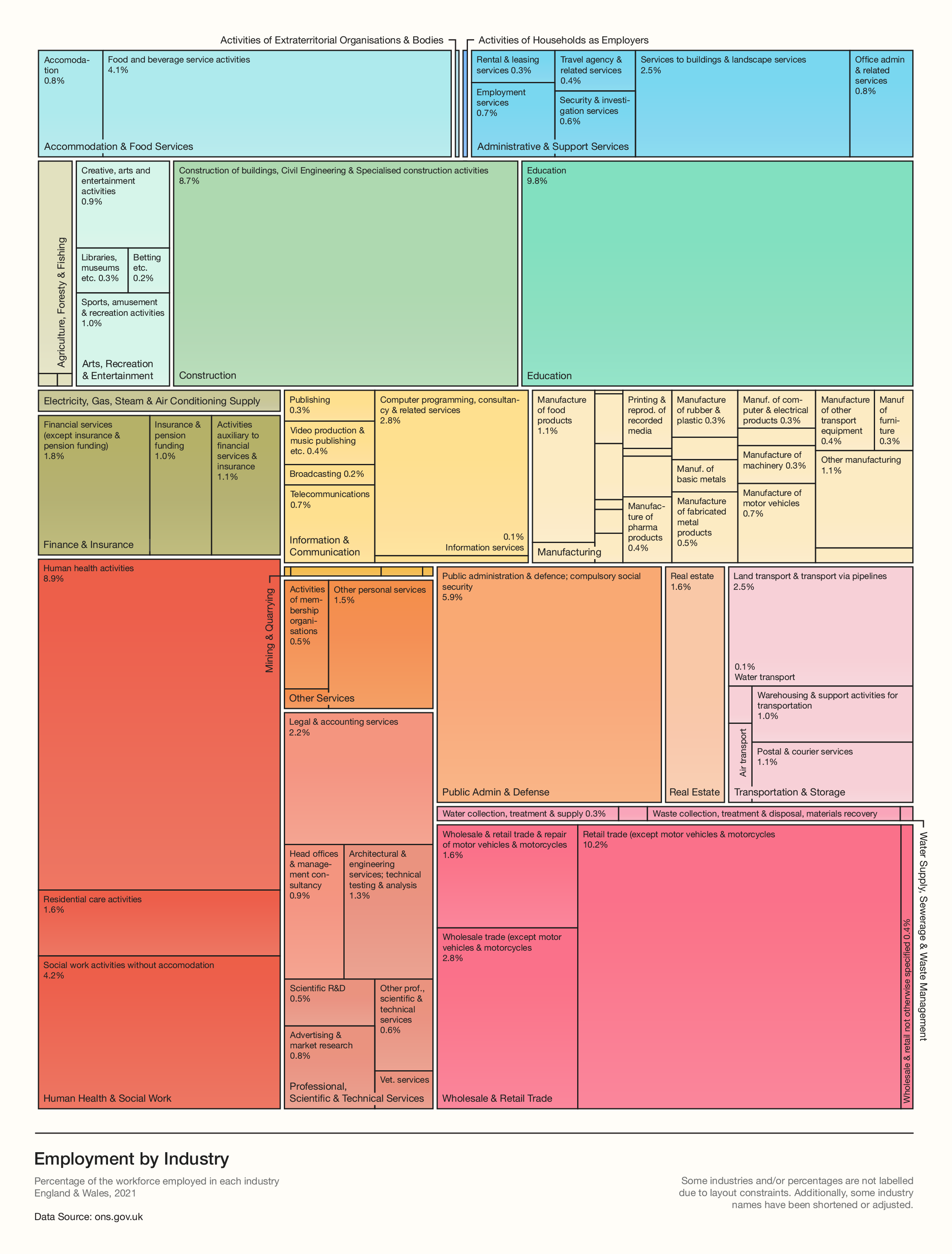 Some other interesting observations are that Legal & accounting services only makes up 2.2% of employment, which is quite a lot lower than I expected, given the prominence of the big accounting firms. In a similar way, Financial services (1.8%) is smaller than I thought it would be. Employment in the supply of utilities also appears quite low compared to my expectations, with only 0.6% working the Electricity, Gas, Steam & Air Conditioning Supply sector and 0.7% employed in the Water Supply, Sewerage & Waste Management Industry. The Construction industry is however slightly larger than I anticipated, employing 8.7% of workers, but I suppose this is expected given the wide variety of roles involved. Additionally, perhaps some of the construction-orientated roles within the utilities sector are classified as being in the construction industry, due to the large amount of outsourcing in this sector.