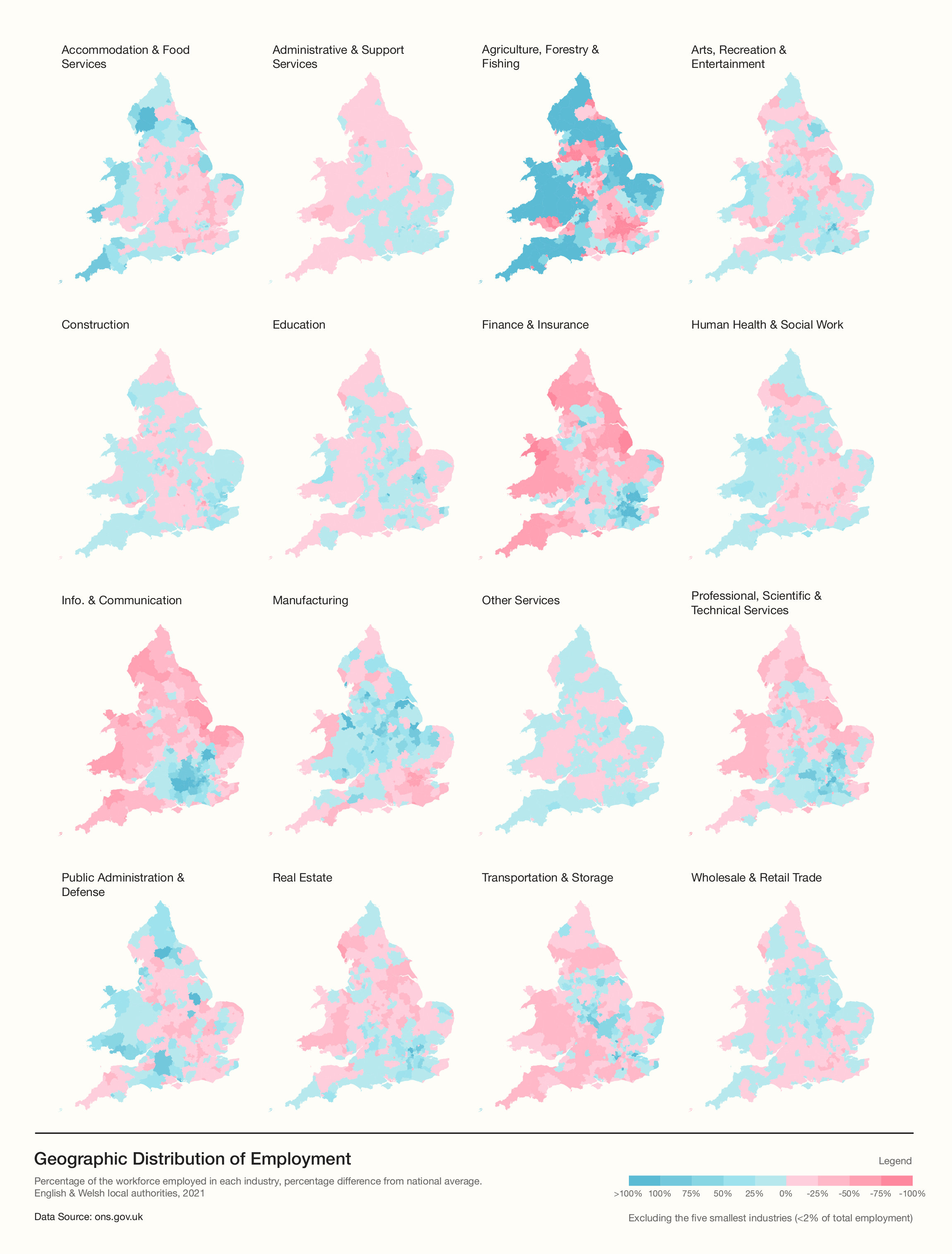 However, other industries, like Agriculture, Forestry & Fishing or Information & Communication have a large overall variation from the average, driven by the variable pros and cons of industries locating in each local authority. For example, white-collar industries tend to be more urban-centric, with a particular focus on London & the South East e.g. Finance & Insurance, Professional, Scientific & Technical Services and Information & Communication.